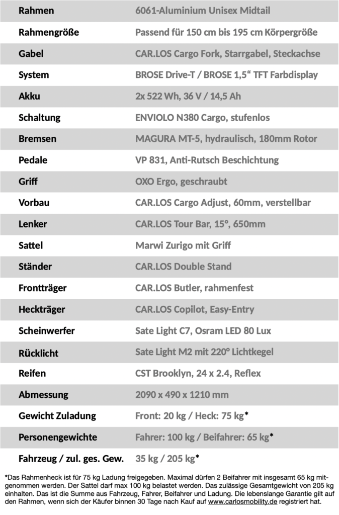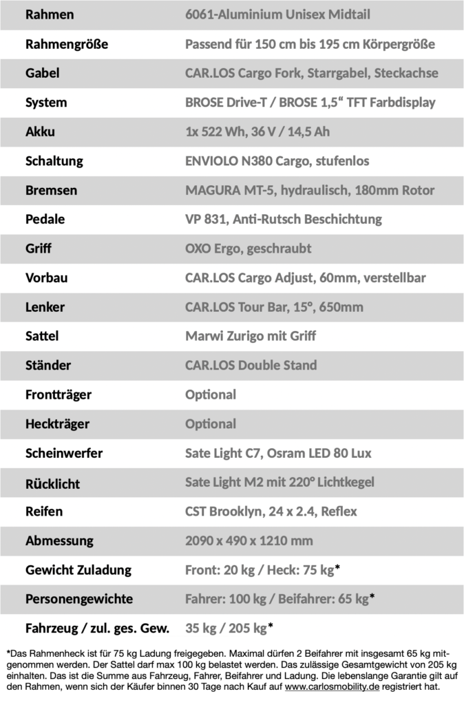 Bewährte Komponenten von Brose, Enviolo und Magura und die markentypische „Komplettpreis-Politik“ von CAR.LOS machen das M attraktiv für alle Biker, die einen echten Allrounder für die große Stadt, die große Tour und gelegentliche große Transportaufgaben suchen.